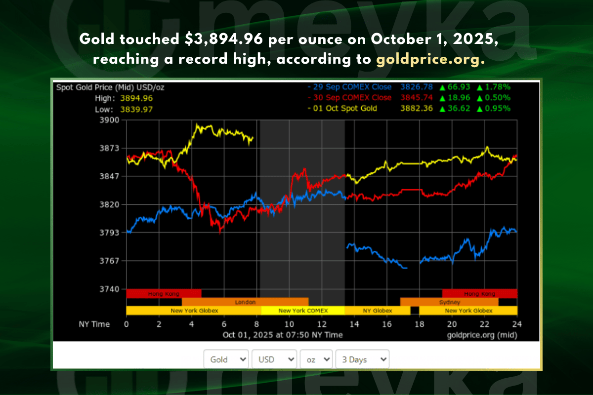 Gold has climbed to fresh highs. On October 1, 2025, spot gold briefly hit record levels near $3,895 per ounce as safe-haven demand spiked. Several drivers explain the move. A U.S. government shutdown raised risk concerns and weakened the dollar. Markets also priced in a near-certain Fed rate cut, which lowers real yields and lifts gold’s appeal.