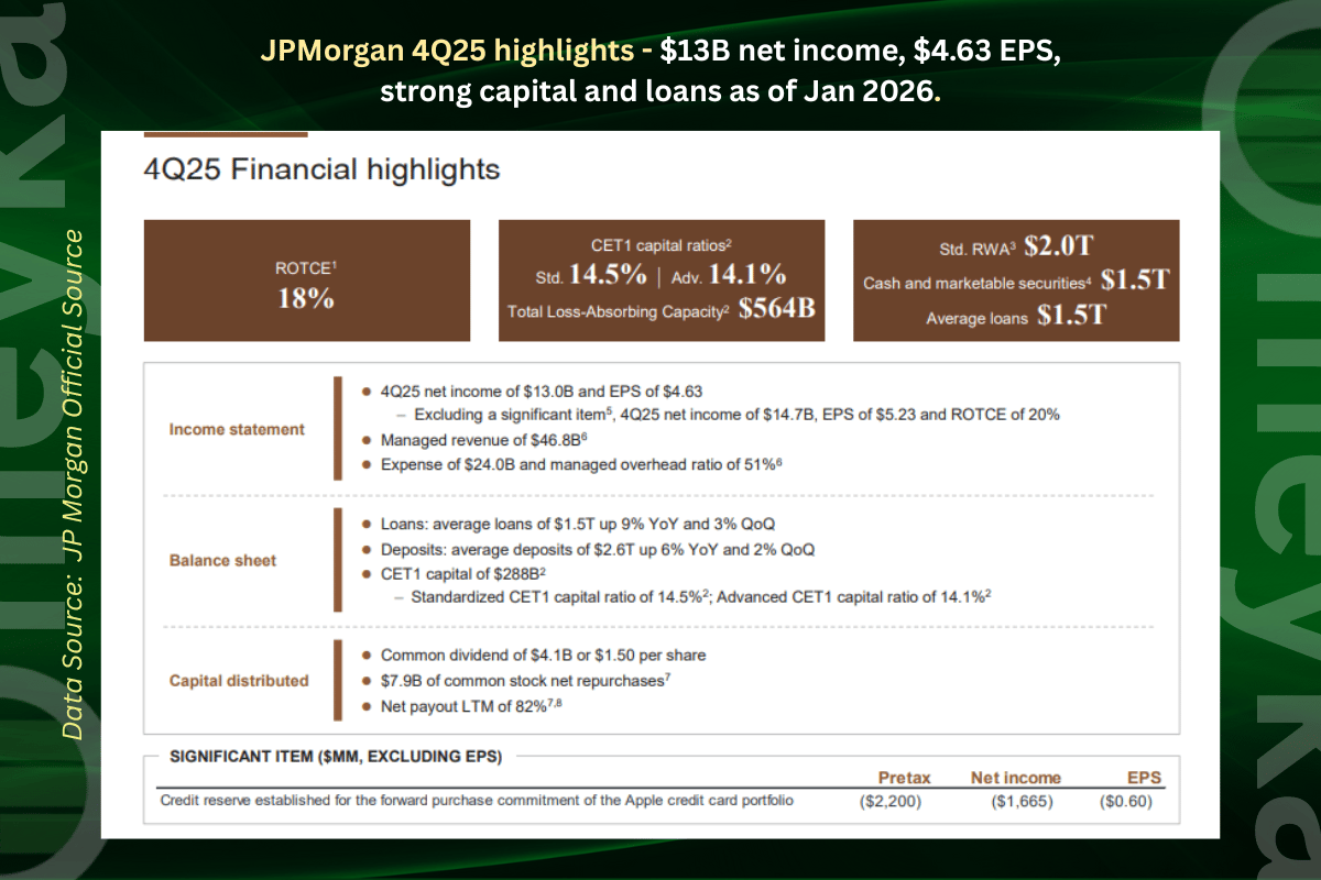 On January 13, 2026, JPMorgan Chase reported its fourth‑quarter 2025 earnings. The bank posted net income of about $13 billion, and revenue rose roughly 7 % to around $46.8 billion year‑over‑year. On a per‑share basis, earnings came in at $4.63, slightly below some forecasts, but adjusted earnings per share were $5.23, beating many analyst estimates. These mixed results helped explain why the stock dipped even after stronger revenue figures.