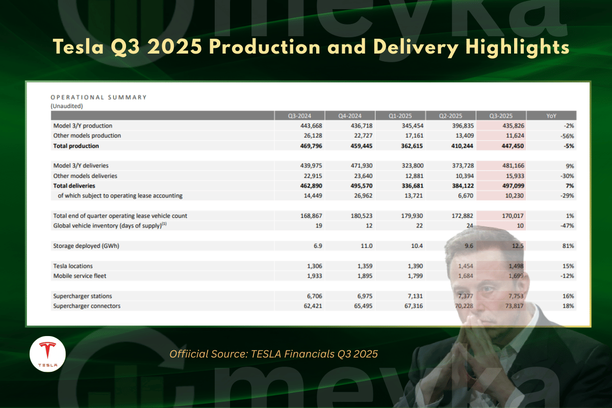 On the production front, Q3 2025 saw strong numbers: roughly 447,450 vehicles manufactured and 497,099 delivered, plus 12.5 GWh of energy storage deployed.